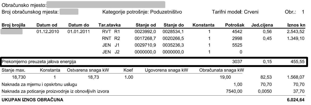 Ukoliko u Vašem mjesečnom računu HEP-a za električnu energiju iznos za prekomjerno preuzetu jalovu energiju iznosi preko 400 kuna pošaljite nam faksom ili mailom presliku računa (sve stranice računa). Pregled računa je besplatan i neobvezujući te BEST ENERGY SOLUTIONS nudi financiranje kompletnog izvođenja projekta. Nakon što pregledamo račun kontaktirati će Vas netko od naših djelatnika. Sa desne strane je primjer gdje je uokviren dio koji se odnosi na jalovu energiju (kliknite na sliku za uvećanje).